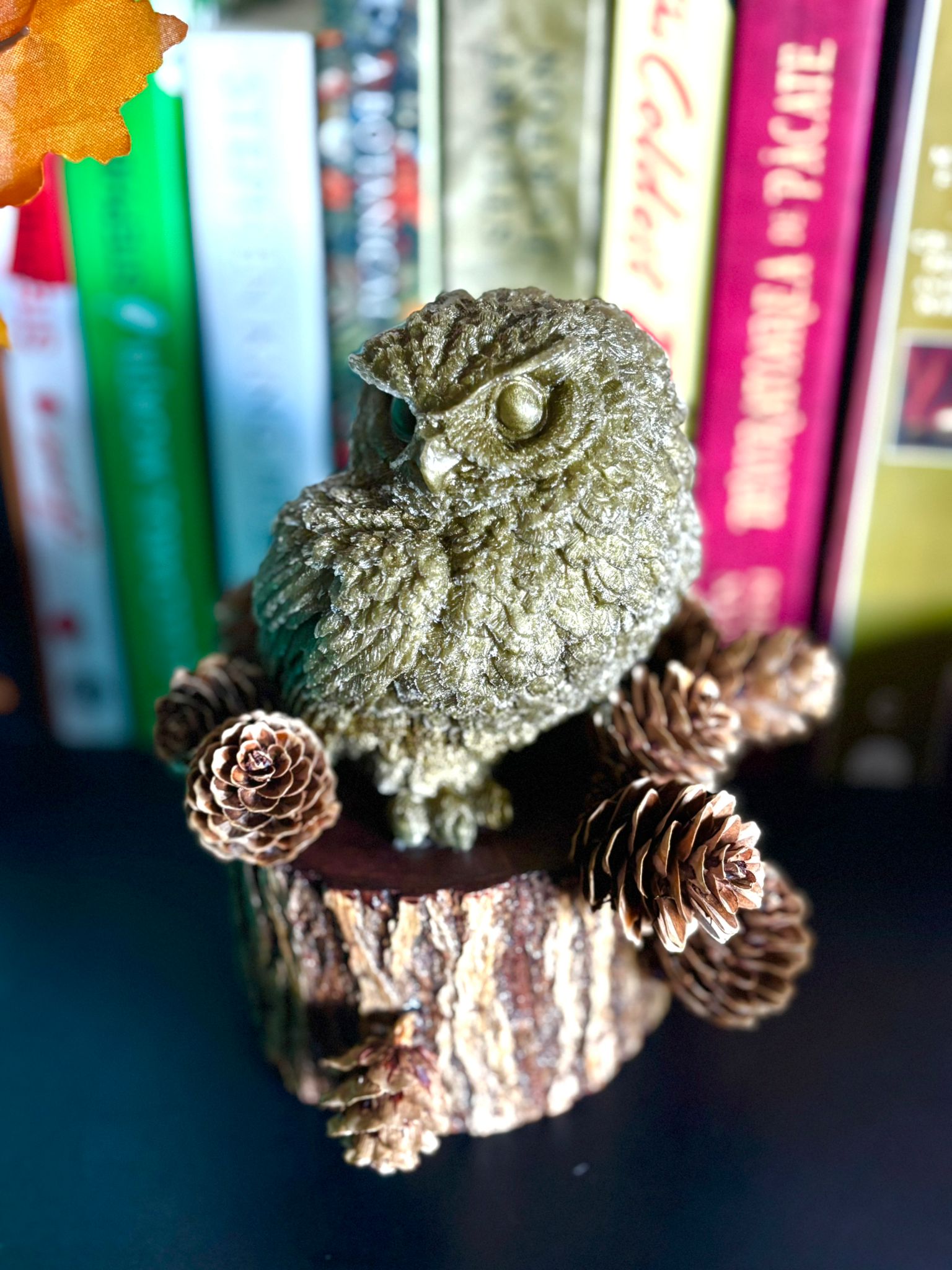 Bufniță decorativă realizată manual din lemn și rășină epoxidică, pictată cu grijă și împodobită cu conuri naturale de brad, ideală pentru decorul bibliotecii sau ca suport elegant pentru cărți.