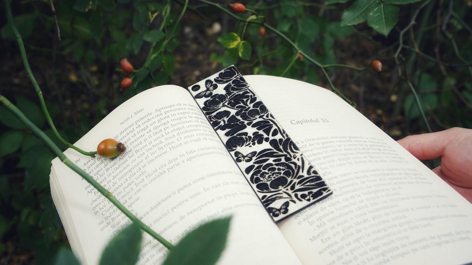 Semn de carte ce poartă parfumul florilor și zborul unui fluture, sculptat în liniștea lemnului.