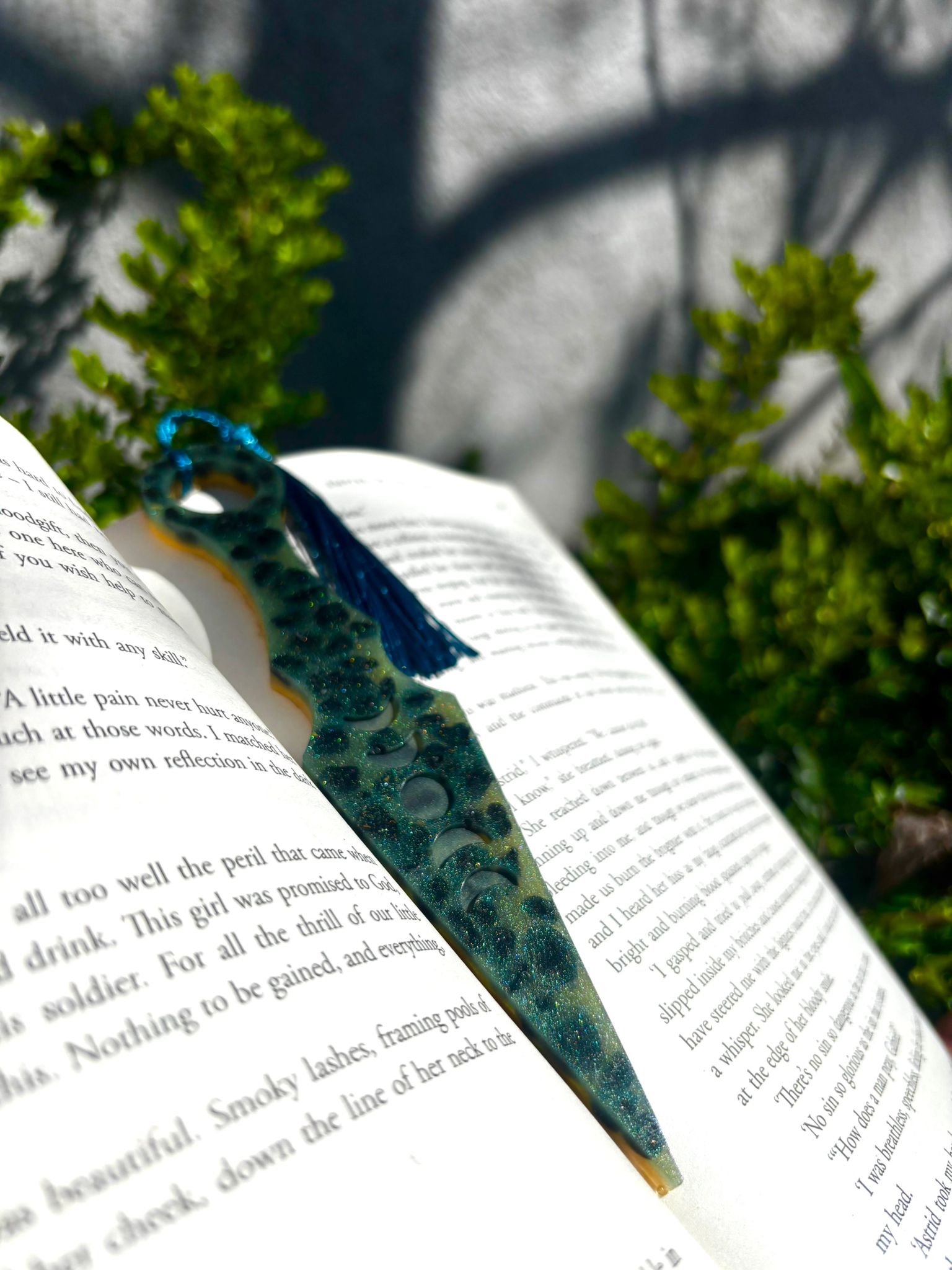 Semn de carte din resina epoxidica, turnat in mai multe straturi, cu pietre decorative incapsulate in interior.
